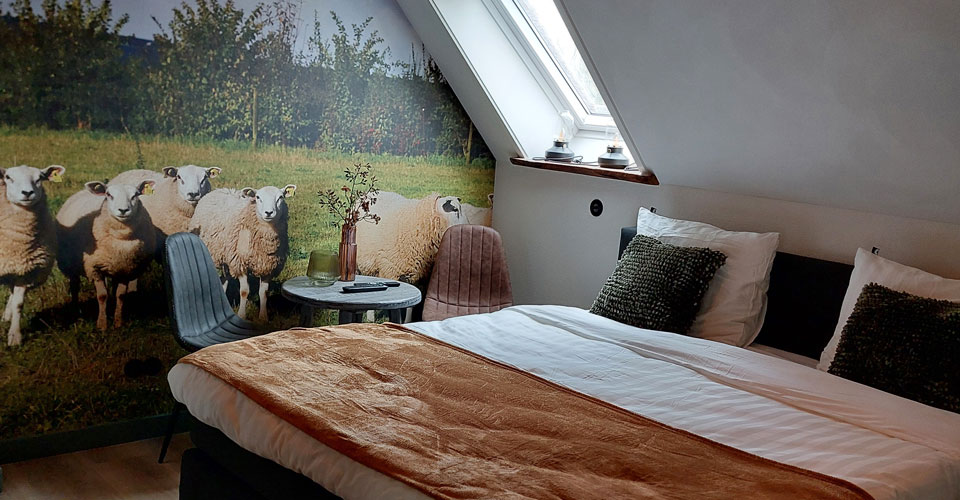 Onze B&B beschikt over vijf ruime kamers, allemaal voorzien van modern eigen sanitair. Drie van deze kamers bevinden zich in de hooiberg, waar ook een gezamenlijke ontbijtruimte is. Twee kamers bevinden zich op de eerste verdieping aan de achterzijde van de woonboerderij.